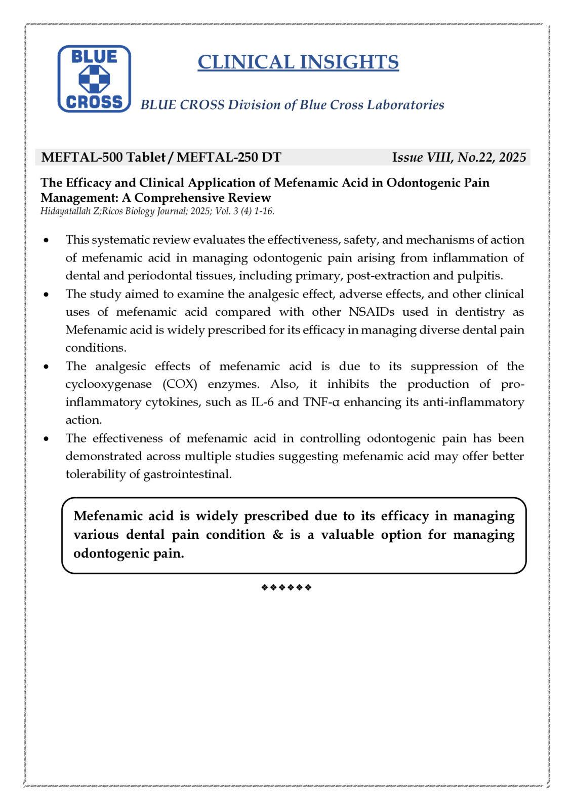 The Efficacy and Clinical Application of Mefenamic Acid in Odontogenic Pain Management: A Comprehensive Review